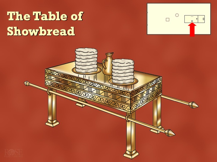 V 10-16 The Table of Showbread symbolized God as the Bread of Life. Only God can satisfy our hunger both physically and spiritually. Located in the Holy Place, the table was made of acacia wood and was 3 feet long by 1½ feet wide by 2¼ feet high. It was covered with pure gold. Like the Ark of the Covenant it too had four rings made of gold fastened to the four corners of the Table. This enabled the Table to be carried with two gold covered acacia poles. The utensils used with the Table were also made of gold. They included plates, dishes, bowls, and pitchers. These were used for the table as well as for the pouring out of drink offerings.