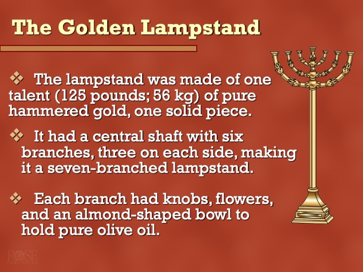 V 17-24 In these verses we have the description of the Lampstand or Menorah, which was the only light in the Holy Place and represented the light of the Lord to His priests, so they could see as they went about their ministry in the Holy place. The Lampstand was made of one piece from 75 pounds of pure gold consisting of the base, shaft, six branches, lamp cups, buds, and blossoms. The six branches had three on each side of the center shaft or stem. Three cups shaped like almond flowers with buds and blossoms were on branch and one was on the center staffs. God’s light is a picture of His Spirit which with God’s Word lights our way that we might serve the Lord in the world.