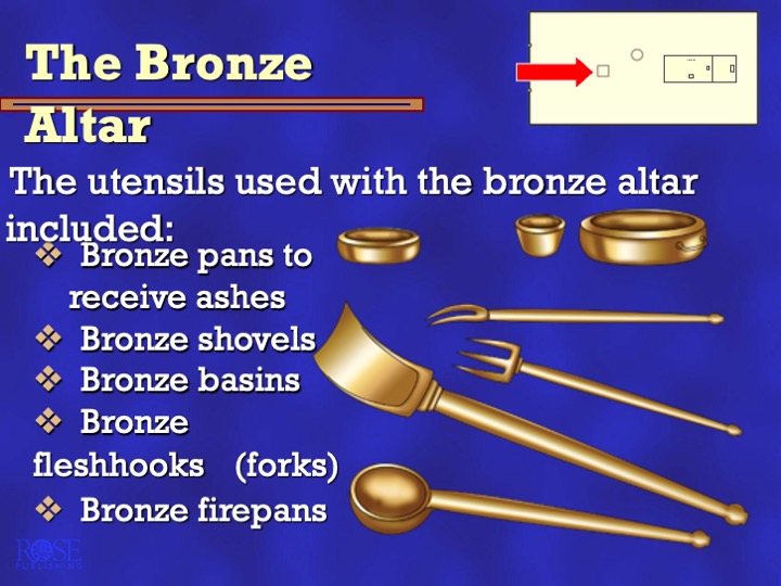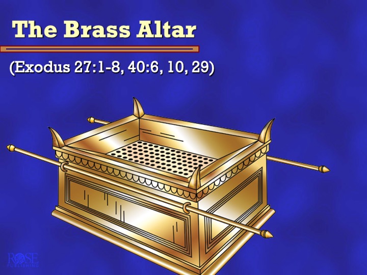 V 1-7 The Altar of Burnt Offering symbolized the need for atonement in order to be reconciled with God. The blazing Altar consumed every sacrifice placed on it, just inside the entrance of the Courtyard (Illus 1-3). The ministry of substituting the life of an animal in exchange for one’s sins was God’s means for justice and mercy to meet. The Altar was made of acacia wood 7½ feet square and 4½ feet high. The horns of the Altar were at the four corners all of one piece. The Altar was overlaid with bronze. Four bronze rings for carrying the Altar were made for the corners which held the carrying poles. The carrying poles were made of acacia wood, overlaid with bronze, and inserted into the rings for carrying the Altar. The Altar was hollow allowing it to be lighter and easier to carry. The utensils were made of bronze as was the grate that was placed under the ledge half-way up the Altar (Illus 3). The Altar symbolizes the need of man for atonement pointing to the reality that our sins have separated us from God (Isaiah 59:2; 64:7).