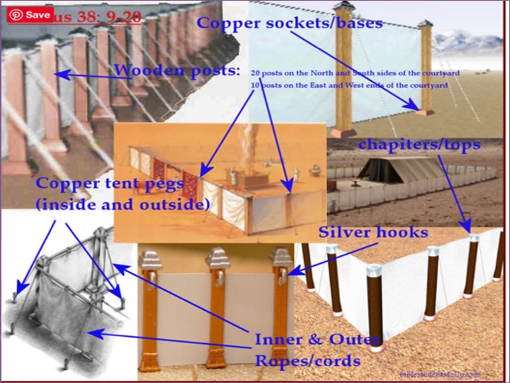 The entrance or door to the Courtyard was made of linen and embroidered with blue, purple, and scarlet yarn. It was made 30 feet long and 7½ feet high just like the Courtyard walls. The builders made four posts and set them into four bronze bases. Hooks and bands of silver were made and the top of each post was overlaid with silver. The tent pegs for the Tabernacle and Courtyard were made of bronze.